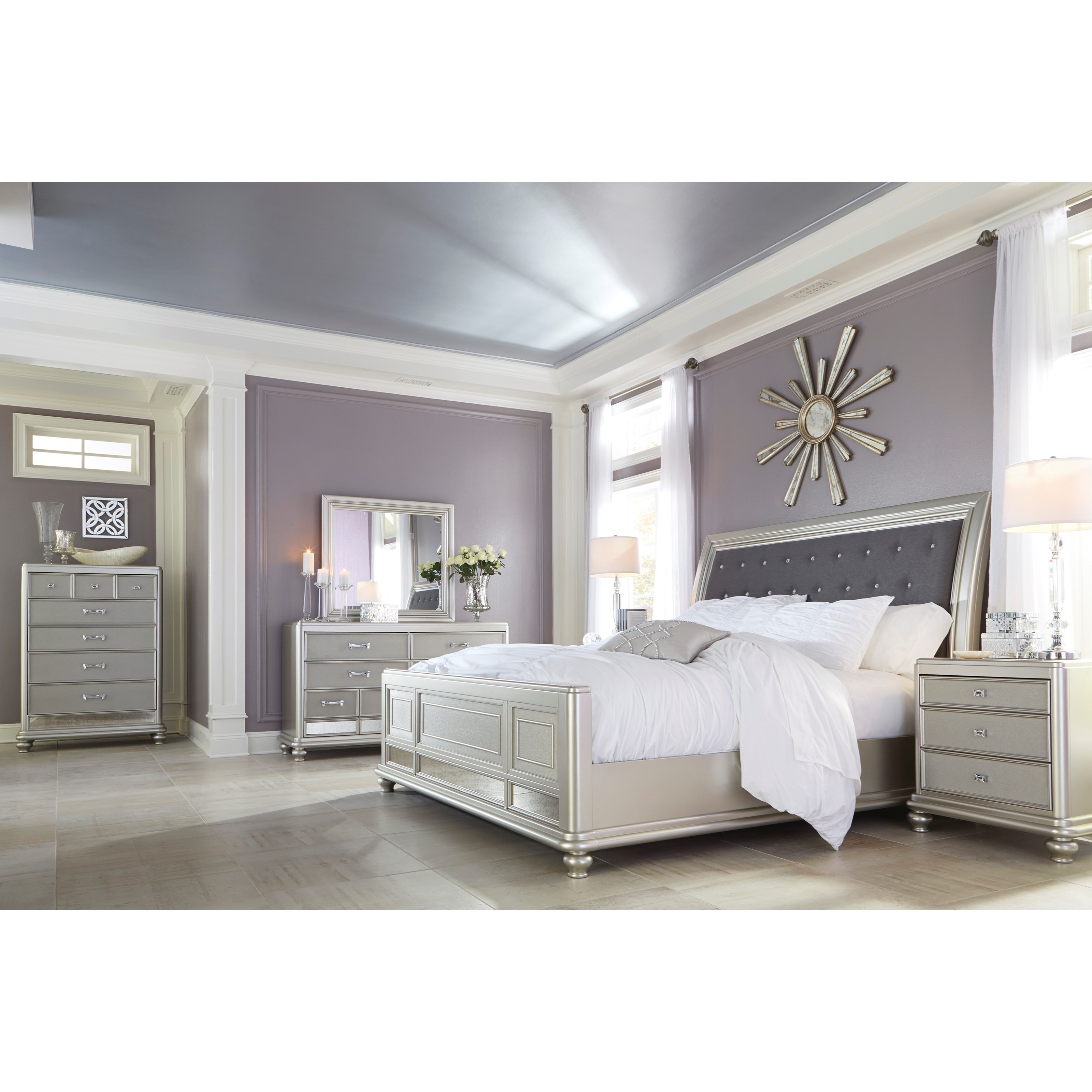 Exquisite frame's metallic tone channels that Hollywood Regency flair you've been dreaming of. Exquisite frame's metallic tone channels that Hollywood Regency flair you've been dreaming of. The Coralayne Bedroom Set by Signature Design allures with the glitz and glam befitting silver screen queens.